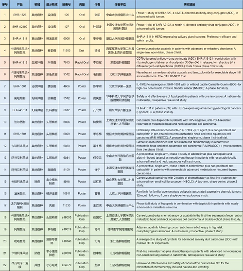 在肺癌、妇科肿瘤、淋巴瘤、膀胱癌、头颈肿瘤、黑色素瘤、肉瘤、鼻咽癌、脊索瘤、唾液腺癌、胸腺癌、硬纤维瘤、涎腺导管癌等其他多个疾病领域,卡瑞利珠单抗、阿帕替尼、阿得贝利单抗、吡咯替尼、达尔西利、氟唑帕利、法米替尼、SHR-1501、瑞拉芙普-α(SHR-1701)、SHR-1826、瑞康曲妥珠单抗(SHR-A1811)、SHR-A1912、SHR-A2102等抗肿瘤创新药相关研究一共入选了4项口头报告、2项快速口头报告、11项壁报展示和4项线上发表,彰显了尊龙凯时Ag医药强劲的研发实力。此外,昂丹司琼口溶膜在防治化疗导致的恶心呕吐方面展现出了良好的疗效,本次ASCO年会有1项研究线上发表。