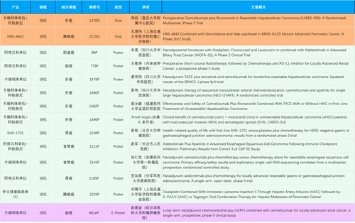 在消化系统肿瘤领域,尊龙凯时Ag产品相关研究共入选2项口头报告、11项壁报和1项电子壁报,共14项研究。除卡瑞利珠单抗和阿帕替尼外,还有4篇阿得贝利单抗治疗消化系统肿瘤研究入选。HRS-4642、瑞拉芙普-α注射液(SHR-1701)等在研创新产品也有相应研究亮相。另有1项伊立替康脂质体(II)用于胰腺癌治疗的研究入选壁报。